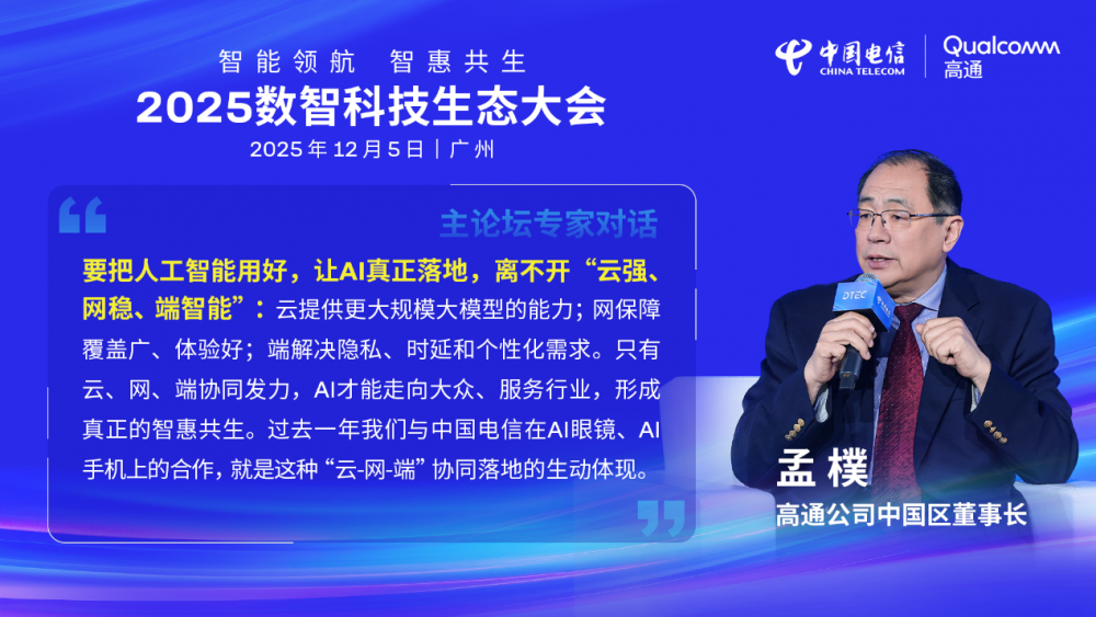 在生成式AI快速演进、模型能力和应用场景持续扩展的背景下,“智能云体系生态”成为本次大会主论坛关注的核心议题之一。高通公司中国区董事长孟樸受邀参与该主题的专家对话环节,从高通长期深耕的终端侧AI视角出发,分享“云-网-端”协同发展对推动AI普惠落地的趋势洞察。