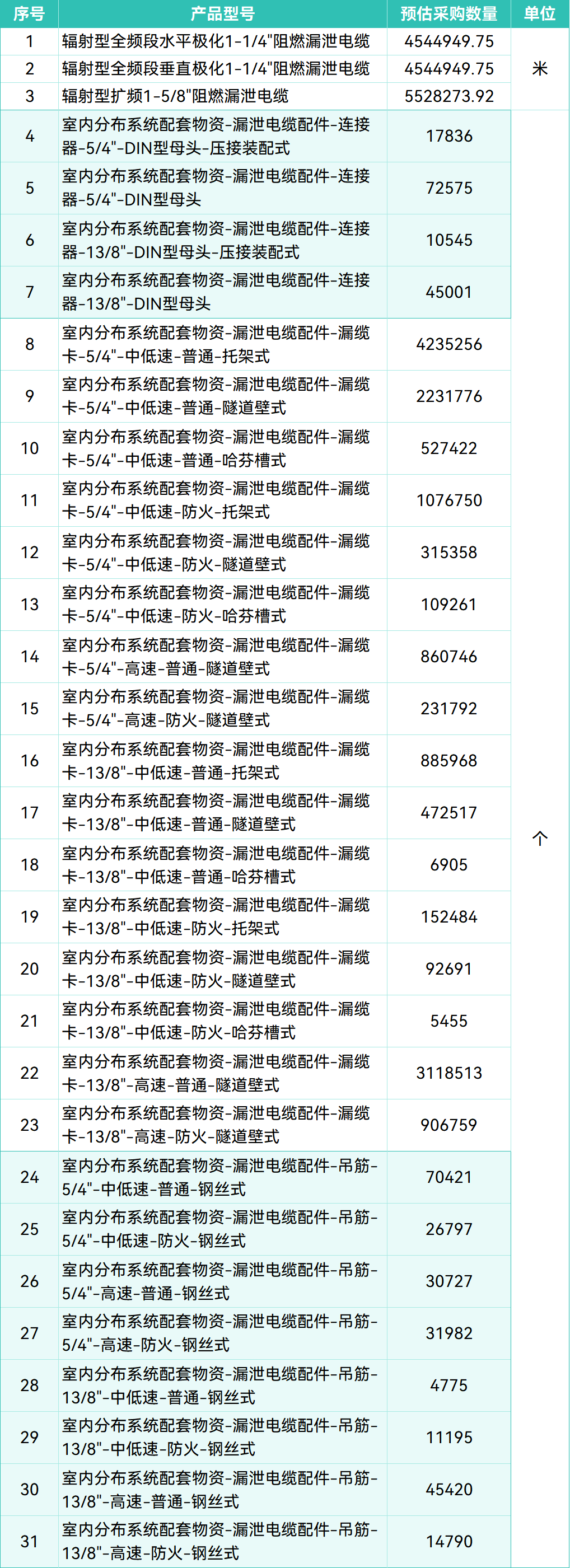 本项目采购品类涵盖辐射型全频段水平/垂直极化1-1/4"阻燃漏缆、辐射型扩频1-5/8"阻燃漏缆等三大类漏泄电缆,预估采购总量分别高达约454万米和553万米,总采购量超1400万米,此外,项目还包括了连接器、漏缆卡、吊筋等三大类共计28个细分型号的配套配件。