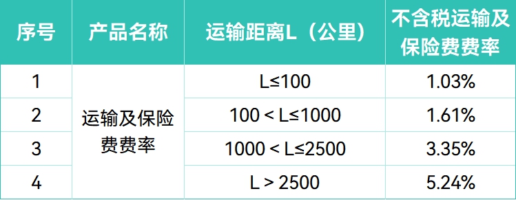 此外 ,运输及保险费率则按运输距离阶梯设定,最高不超过5.24%。
