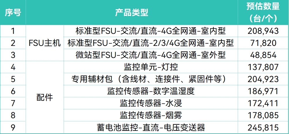 本次招标涵盖标准型、微站型FSU主机及灯控单元、温湿度传感器等九类配套设备,交货范围覆盖全国。