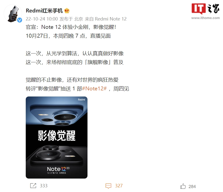 今日上午,Redmi 红米手机官方宣布,Redmi Note 12 系列将于 10 月 27 日(周四)19:00 发布,宣传语为“影像觉醒”。