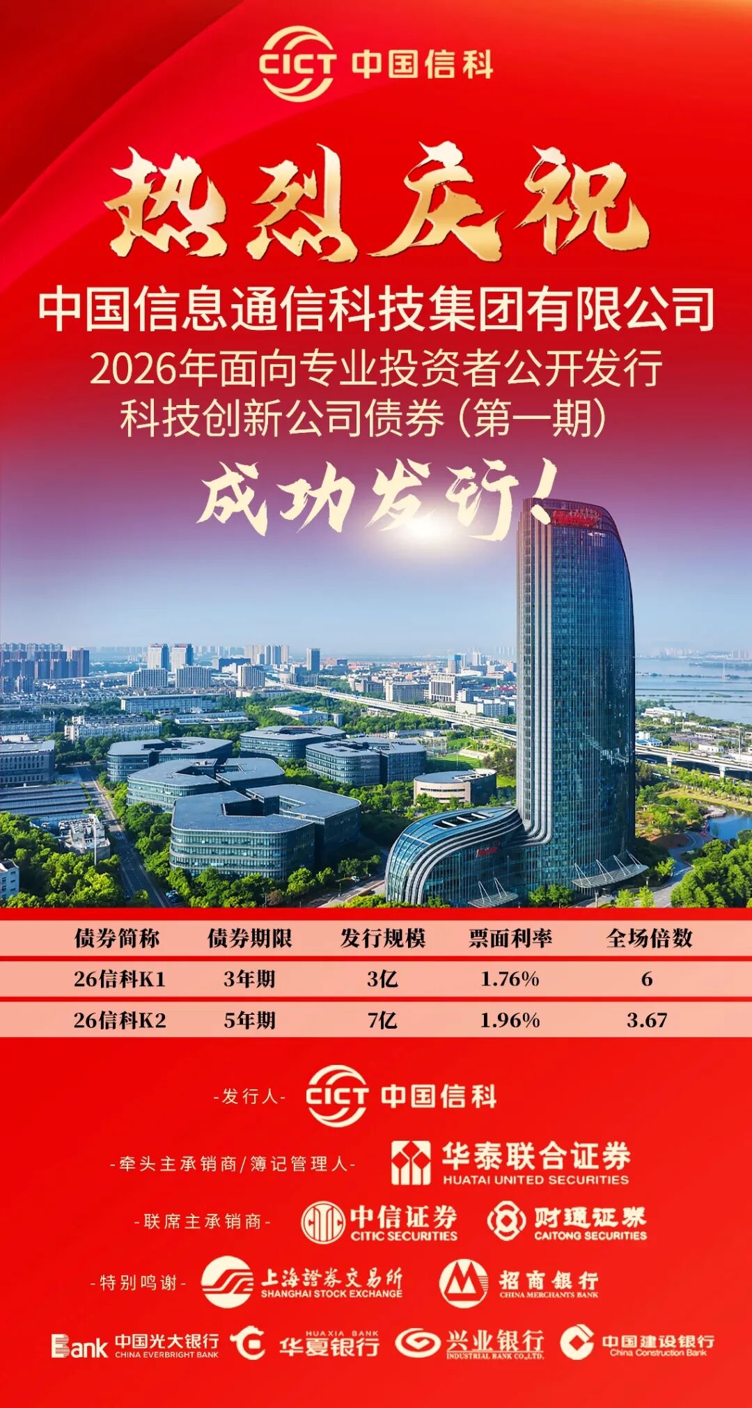 本期债券由华泰联合证券担任牵头主承销商,中信证券、财通证券作为联席主承销商参与发行。此次市场投资者的踊跃参与,既彰显出他们对中国信科在科技领域的长期积淀、技术实力与行业领先地位的高度认可,也印证了市场对国家通过科技创新为实体经济注入澎湃动能、筑牢高质量发展根基的坚定信念。