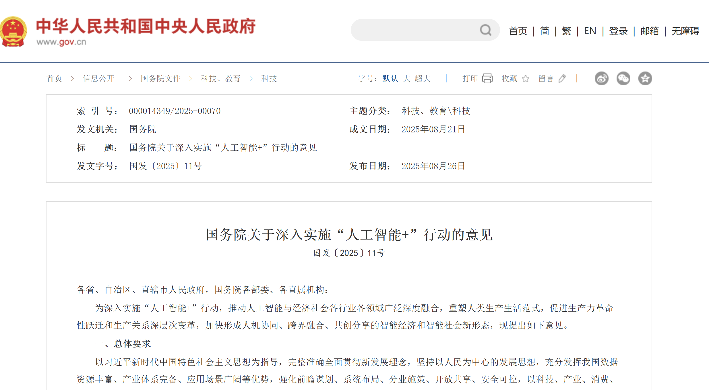 C114讯 8月26日消息 今日,国务院官网发布了《关于深入实施“人工智能+”行动的意见》(以下简称《意见》)。