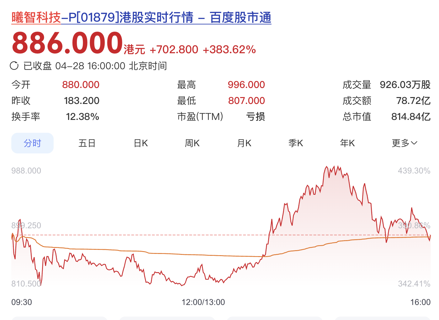 截至4月28日收盘,曦智科技涨383.62%,股价886港元/股,总市值814.84亿港元。