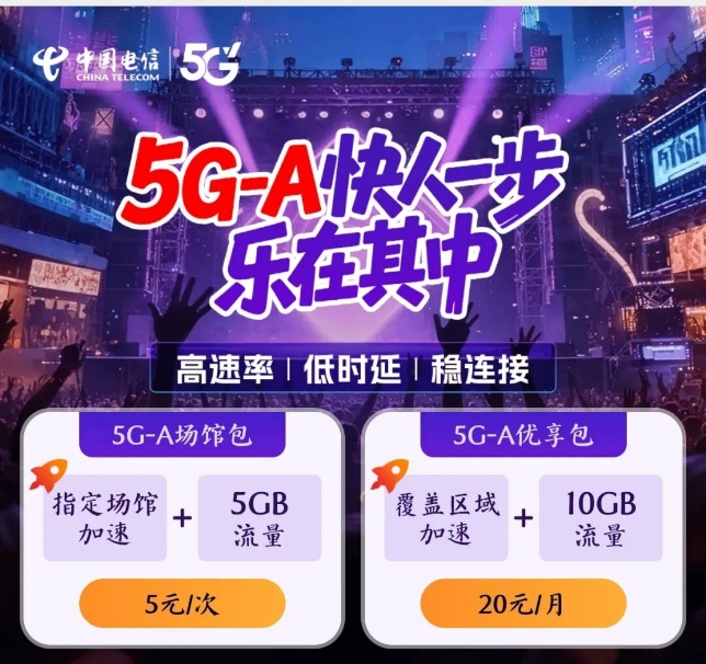 电信5G-A场馆包按次订购,内含5G通用流量,并且已覆盖江苏省13地市各大场馆,看演唱会、音乐节,随订随用。同时江苏电信还贴心推出的20元10GB优享月包,让你用一杯奶茶钱,即可享受一个月5G-A极速服务,还附带全国通用大流量。 用“小小叠加包“,实现”体验大升级”。 让你无论在网络上做什么,都快人一步,乐在其中。
