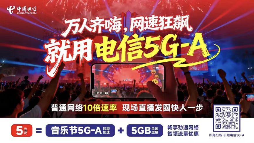 此外,江苏电信为此次咪豆音乐节打造的5元含5G流量的5G-A场馆包,可以享受2日(次日失效)下行峰值速率3Gbps、上行峰值速率400Mbps的超高5G-A速率。
