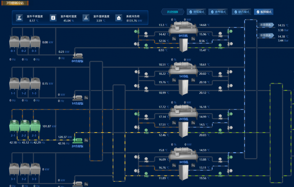 本方案优化节能控制系统为基于系统行为的全局优化控制,是以能耗模型为基础的整个中央空调系统多维、主动寻优的节能控制系统。系统建立在冷冻机房的每个设备整体性能特性的基础上,通过多维寻优的方法,寻找满足工艺设计及冷量需求下整个冷冻机房的最佳能效点,从而实现最佳节能目标。针对冷机、预冷、板换三种运行模式动态优化,指导运维人员摆脱经验束缚,在夏季工况下实现10.71%的节能量,冬季工况下节能达6.6%,全年综合节能率突破8%。