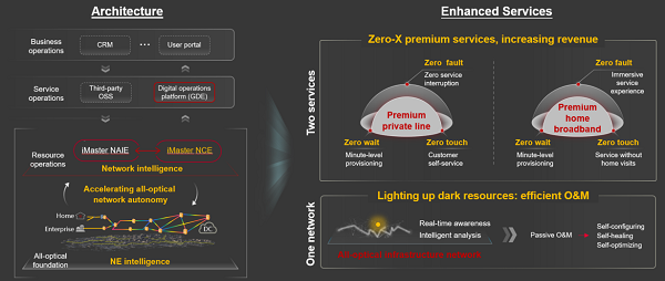 全光网络为用户提升了极致的网络服务体验,随着企业专线和家庭宽带的服务升级,精品OTN专线和家宽服务成为光网络新的增长点。自治化技术的出现使能运营商实现分钟级的开通,为用户带来了零等待的服务;针对故障定位等挑战性的环节,智能化技术提供了根因分析,精准识别网络的主要问题,实现了零接触的维护;在业务升级、网络故障等过程中,智能化技术可以精准预判,及时为业务切换匹配优质资源,实现全生命周期的零故障体验。