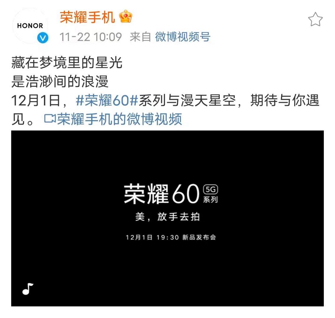 11月22日上午,荣耀手机官方微博公布了荣耀60系列的首支预热悬疑视频,并宣布将于12月1日19点30正式发布数字系列全新一代产品——荣耀60系列。此外悬疑视频释放了荣耀60系列全新配色星空色的信息和屏幕设计,此外镜头模组延续了荣耀50系列的双圆环经典设计,让即将发布的荣耀60系列备受期待。