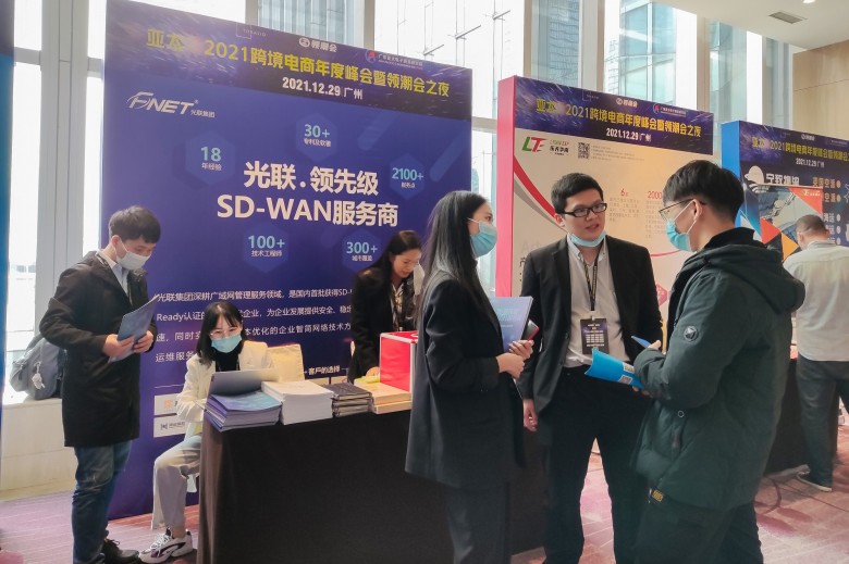 盛会展区,光联作为领先级SD-WAN服务商闪耀全场,SD-WAN跨境电商整体解决方案及优秀应用案例,吸引了不少参会嘉宾前来与光联专家团队交流探讨。