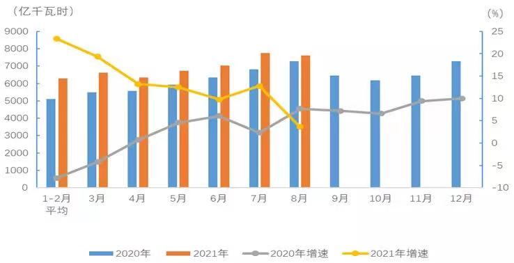 虽说“双控”跟大规模限电拥有直接的关系,但电力供应紧张,也是推动这波限电浪潮的主要原因之一。中电联数据显示,2021年1-8月,全国全社会用电量54704亿千瓦时,同比增长13.8%。比规模以上企业发电量增速高达2.5个百分点,创下2003年以来增速差的最大值,反映了用电紧张的局面。另一面,在电力供给端,水力发电数据同比负增长,而火力发电则遭遇煤炭生产监管、进口煤炭减少等因素限制,无法弥补煤电供给短缺问题。