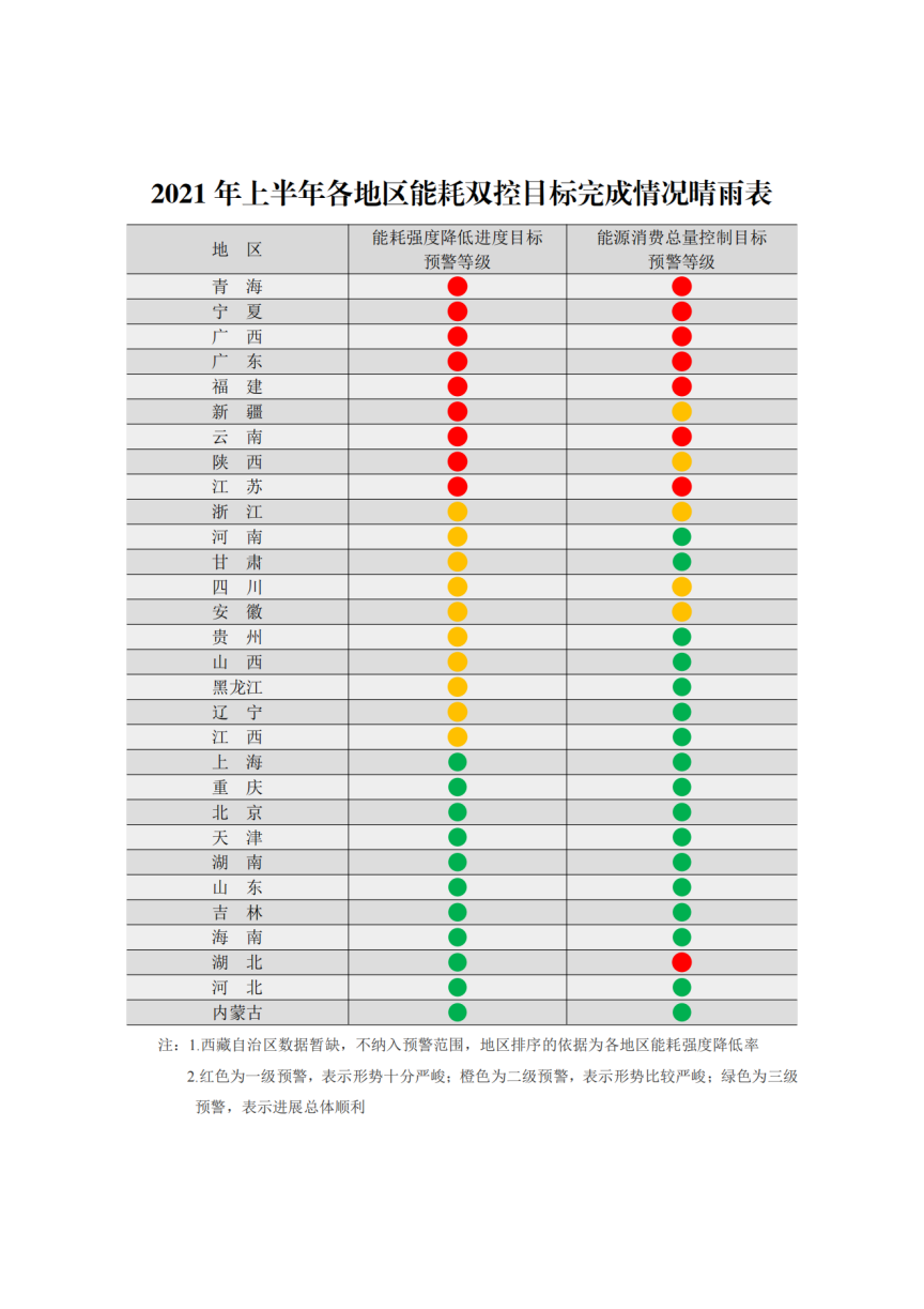 2021年上半年各地区能耗双控目标完成情况晴雨表