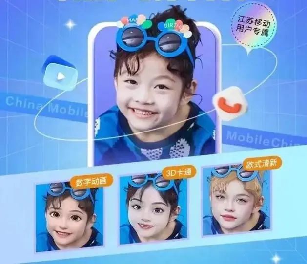 作为率先试点的江苏移动用户,还能享受到“点亮屏幕”的专属福利“AI创作”。用户上传人物照片后,即可利用个性化AI创作功能自动生成数字动画、3D卡通、欧式清新三种不同风格的图片,作为自己“点亮屏幕”的个性化视频内容,让通话更有个性。(说明:这里的AI创作均为用户主动行为,用于娱乐用途,可清晰识别娱乐目的)