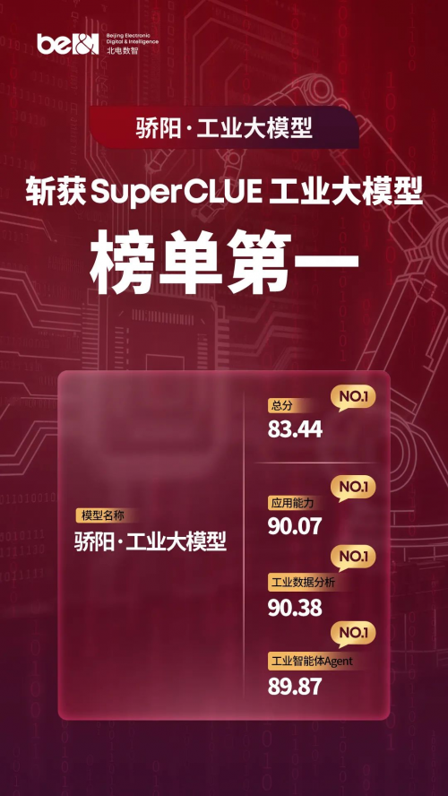 日前,2025世界人工智能大会“智造融合:AI驱动工业范式变革”主题论坛上,北电数智正式发布了一款应用能力领先的工业领域垂类大模型——骄阳・工业大模型。值得一提的是,在近期国内权威第三方评测机构SuperCLUE发布的中文原生工业大模型测评基准SC-Industry最新榜单中,北电数智骄阳・工业大模型,以83.44的总分位居综合排名第一,且在“应用能力”维度及“工业数据分析”“工业智能体Agent”两个子项能力上均拔得头筹。