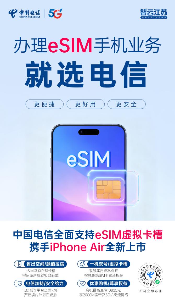 随着工信部eSIM手机商用试验批复落地,中国电信在全国31个省区市同步启动eSIM手机业务,江苏电信用户对“无卡通信”展现出高度期待。自10月22日iPhone Air手机上线以来,这股通信技术革新的浪潮进一步深度覆盖江苏大地,江苏电信全面支持eSIM手机业务,率先开通预约通道,截至目前,预约量突破2万人次,业务办理热度居高不下。
