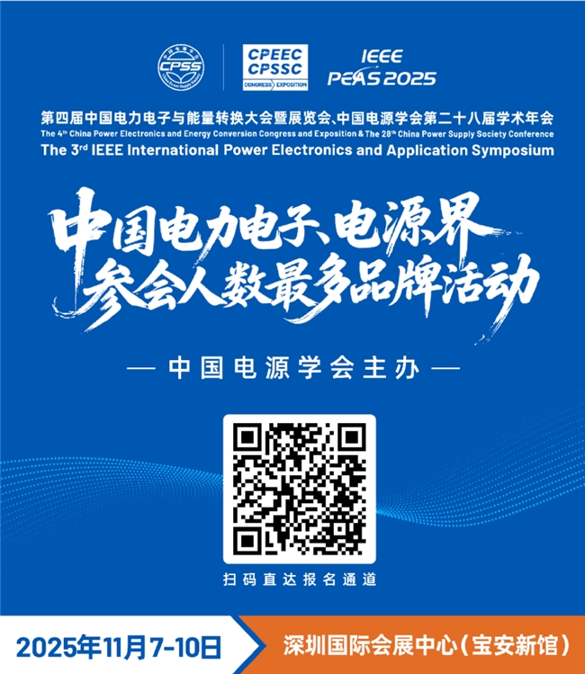 第四届中国电力电子与能量转换大会暨展览会、中国电源学会第二十八届学术年会(CPEEC & CPSSC 2025)将于2025年11月7日-10日,在深圳国际会展中心(宝安新馆)举办。活动同期还将举办The 3rd IEEE International Power Electronics and Application Symposium (PEAS 2025)。