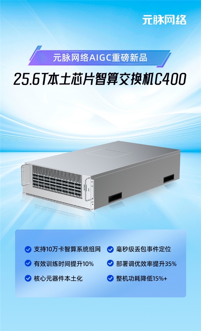 网络,作为实现算力互联的中枢神经,是构建大规模智算系统的关键纽带,也是决定海量算力资源能否被高效连接的核心要素。近日,元脉网络正式发布全新算力互联引擎——25.6T本土芯片智算交换机C400,该产品集安全可靠、开放灵活、智能运维、极致性能、绿色节能于一身,解决了大规模算力系统在传输稳定性、运维效率、可靠性等方面的挑战,满足智算中心、云数据中心等场景的传输需求,助推本土算力高质量发展。