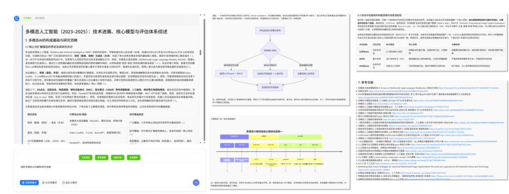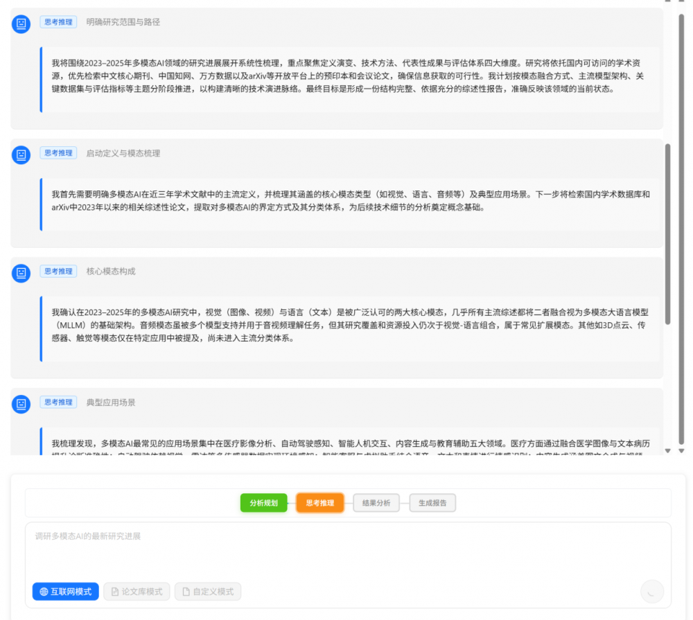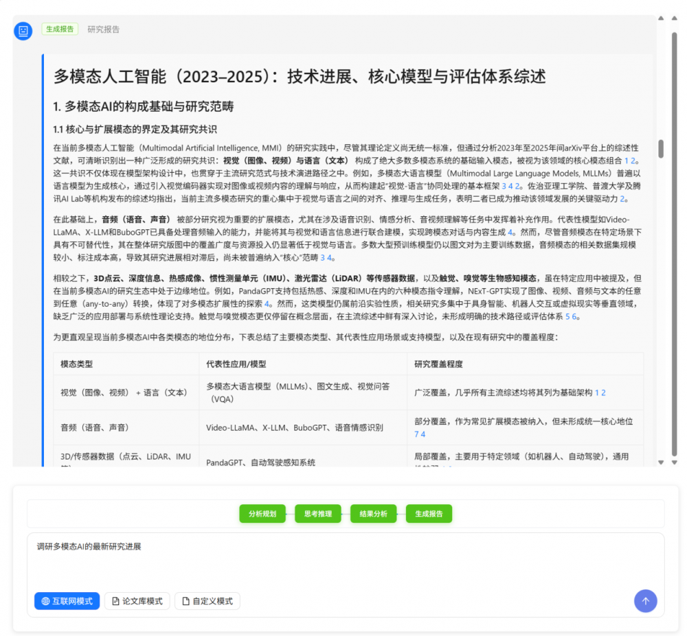 新版本在功能深化、体验升级与场景拓展等方面均有显著提升。生成内容图文并茂、报告输出格式更规范,能提供互联网模式、论文库模式、自定义模式等多种研究模式选择。从“自动分析研究主题、规划调研计划、深度搜索信息源到分析调研结果、产出研究报告”全流程仅需10-15分钟。