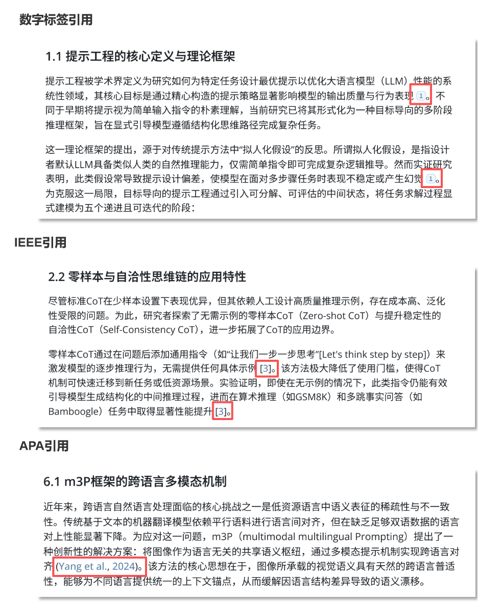 另外,报告内容支持用户查看引用来源,方便追溯AI生成内容的原始依据,验证信息的真实性和有效性,减少“学术幻觉”现象,确保生成内容的可靠性。并且,论文库模式下,研究报告支持3种引用格式,涵盖APA和IEEE两种国际标准引用格式,可以满足不同学科领域的引用规范要求。同时,研究报告支持导出word或pdf格式,满足用户的多样化使用和存档需求。
