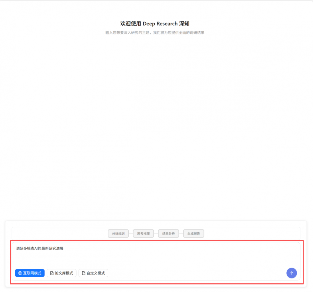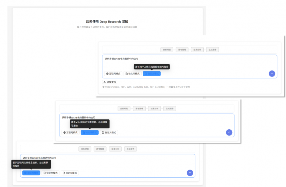 自定义模式支持用户上传文档,基于用户限定数据进行深度调研并撰写研究报告,此模式将AI的分析能力与用户独有的知识资产相结合,为用户提供个性化的研究服务。