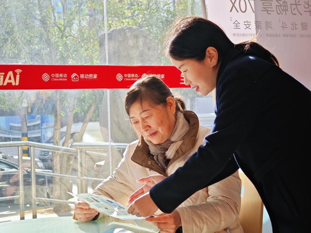(在中国移动营业厅内,工作人员细心地为老人讲解反诈知识)