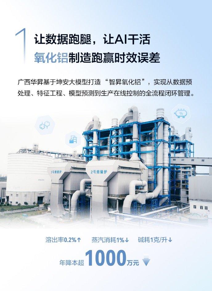 氧化铝生产过程存在检测数据时效性差、生产工艺流程复杂等问题。广西华昇基于坤安大模型打造了氧化铝行业首个AI大模型“智昇氧化铝”,成功应用于蒸发、溶出和沉降三个关键工序,研发出分钟级指标预测模型,并依托中铝集团强大的算力中心,实现了从数据预处理、特征工程、模型预测到生产在线控制的全流程闭环管理。据初步估算,广西华昇生产主控操作工作量降低85%,取样及化验效率提升30%,溶出率提高0.2%,蒸汽消耗降低1%,碱耗降低1克/升,年降本超1000万元。