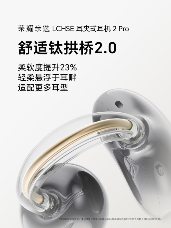 荣耀耳夹耳机2 Pro延续开放式架构设计,内置升级后的舒适钛拱桥2.0,拱桥内内置记忆钢丝和钛合金材料,柔软度和耐用性都得到了增强,彻底解决耳机佩戴的闷胀感和不适感。荣耀耳夹耳机2 Pro支持左右耳自适应佩戴设计和佩戴检测功能,无需额外操作即可轻松佩戴,耳机整体延续前代的轻量化机身,即使长时间通勤或剧烈运动也能保持稳固贴合,佩戴舒适度再升级。
