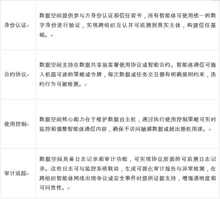 与此同时,正在全球范围内大规模推广的数据空间(Data Space)——为应对这一问题提供了可行的解决方案。作为新型数据共享架构理念,数据空间的核心是在跨组织数据交换中嵌入信任与治理机制,包括身份认证、数据使用合约、安全传输和审计等功能。通过将智能体接口协议机制与数据空间融合,既能发挥智能体自动获取和处理数据的优势,又能通过数据空间来确保组织的数据自主权及合规性,有效解决了“强智能协作能力”与“严数据治理要求”之间的矛盾。