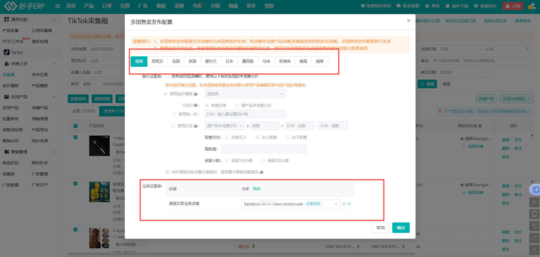 完成设置后,后续发布产品时,只需在发布配置页面勾选【多国售卖】,系统将自动调用已配置的发货仓库,从而有效避免因仓库信息缺失而导致的发布失败。
