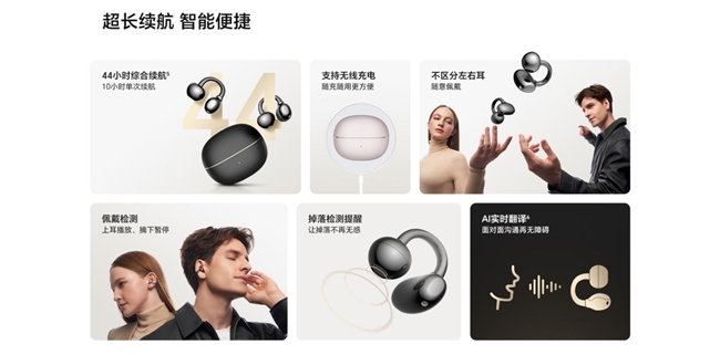 荣耀耳夹耳机2 Pro除了支持左右耳自适应佩戴、智能佩戴检测及掉落提醒功能之外,还新增了电点头接听功能,手机来电只需点头即可实现接听,彻底解放双手,轻松畅聊。荣耀耳夹耳机2 Pro内置AI实时翻译功能,轻松实现跨国沟通;除此之外,还支持双设备流转,实现多设备间自动无缝切换;内置语音助手唤醒功能,无需动手,即可通过语音即可完成播放控制、信息查询、提醒设置等操作,方便快捷。
