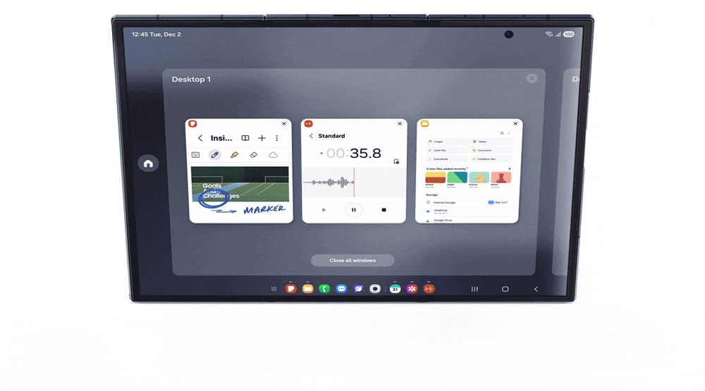 三星Galaxy Z TriFold还是首款可在机身本地运行Samsung DeX[10]的Galaxy手机,让用户可以轻松、快速地设置好办公环境,充分释放大屏的强大潜能。用户只需进入快捷设置面板并选择DeX,即可开启由Galaxy打造的高效工作模式。该模式至多支持四个独立的桌面,每个桌面可同时运行五个应用程序。用户可在其中一个桌面审阅、编辑会议的演示文稿, 随后快速切换至另一个桌面,与朋友聊天或浏览购物网站。为进一步提高办公效率,用户还可连接外部显示器,开启扩展模式打造双屏协同体验。在该模式下,应用程序窗口可在两个屏幕间随心拖放,实现如PC般的高效跨屏操作。三星Galaxy Z TriFold通过蓝牙连接鼠标与键盘后,便可成为便携工作站,帮助用户轻松应对复杂的项目或是创意设计方面的工作。