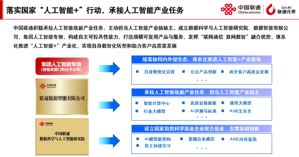 国务院《关于深入实施“人工智能+”行动的意见》明确要求加快人工智能产业化应用,培育新质生产力。中国联通成立数据科学与人工智能研究院、联通数智公司及集团人工智能专班,构建自主可控共性能力,打造可规模复用的产品与服务,全力推进人工智能与实体经济深度融合。