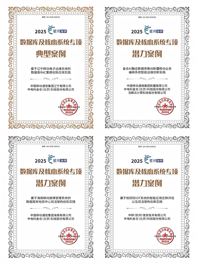 在此次评选中,“基于辽宁移动电子运维系统的数据库RAC集群创新应用实践”获评“数据库及核心系统专项——典型案例”。“金仓AI融合数据库推动新疆移动业务编排系统智能运维创新实践”、“基于海南移动故障管理系统的数据库异地双中心双活架构创新实践”、“基于杭研院IOT系统的智能应用迁移评估以及双活架构创新实践”获评“数据库及核心系统专项——潜力案例”。