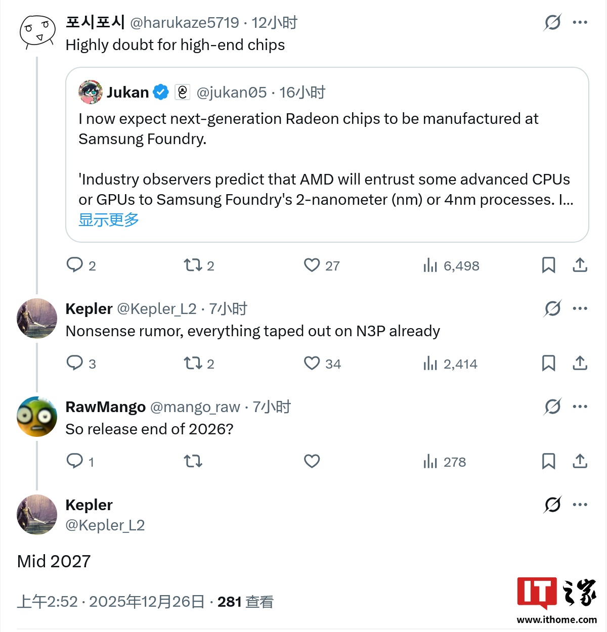 消息人士 @Kepler_L2 在参与 X 平台上有关 AMD 与三星潜在合作可能的讨论时表示,AMD 的下一代 Radeon GPU 芯片已在台积电 N3P 工艺制程节点完成流片,预计在 2027 年中(注:应即当年的 COMPUTEX 台北国际电脑展上)发布。