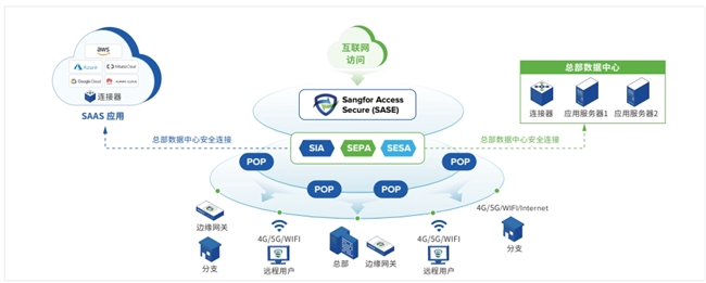 通过Sangfor Access Secure (SASE)方案,为总部、分支、远程用户及云应用(如AWS, Azure, Google Cloud, SaaS)提供统一、安全的全球访问入口,实现安全连接与策略统一管控。
