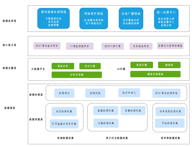 两者的融合,本质上是用大数据的“算力”解决安播监测的“痛点”。传统安播监测多依赖人工巡检和抽样检测,面对如今广播电视、网络直播、短视频等多渠道、海量级的传播场景,早已力不从心。而大数据技术能实现“全量数据采集”——无论是信号传输中的参数数据、内容播放中的画面音频数据,还是用户观看的行为数据,都能被实时捕捉;再通过算法模型进行“智能分析”,快速识别异常信号、违规画面、流量峰值等风险点,让安播监测从“被动应对”转向“主动防控”。其主要逻辑架构如图2所示。