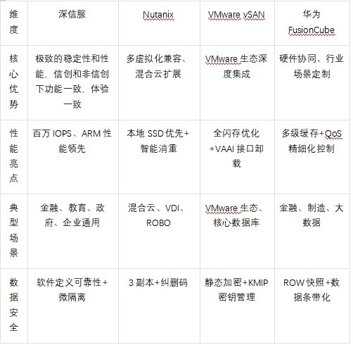 综合对比四大厂商(深信服、Nutanix、VMware、华为)的核心能力,可总结为以下关键维度: