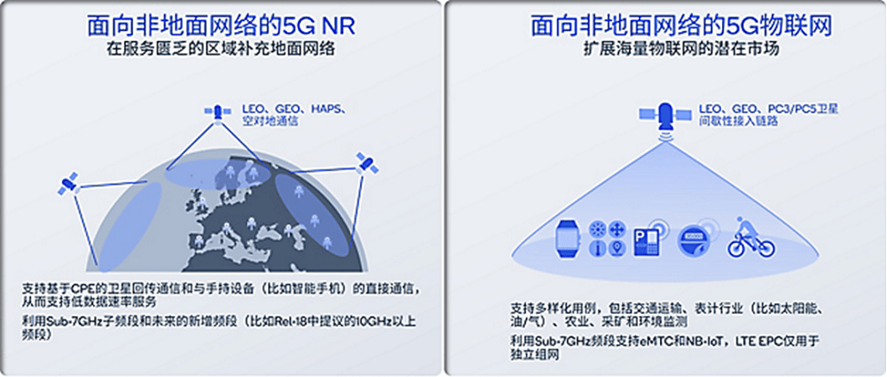 NTN是3GPP在5G标准版本Rel-17中引入的重要技术,在Rel-17中,有两个并行的NTN标准项目来应对移动宽带和低复杂度物联网(IoT)用例,其中一个项目就是采用5G NR框架来进行卫星通信,实现从地面到卫星的固定无线接入(FWA)回传,并为智能手机直接提供低速率数据服务和语音服务。而另一个项目则侧重支持低复杂度eMTC和NB-IoT终端卫星接入,这样可以扩大全球资产追踪等关键用例的网络覆盖范围。