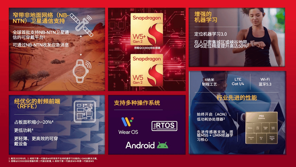 在前一段时间举办的2026年美国拉斯维加斯消费电子展(CES 2026)期间,高通公司的第二代骁龙W5+/W5可穿戴平台被评为CES最佳创新奖,该奖项也被视为CES年度创新成果中的最高级别认可之一。第二代骁龙W5+/W5是高通在去年8月推出的可穿戴平台,根据CES官网公布的信息,第二代骁龙W5+/W5平台最引人注目的突破在于:它是全球首批支持卫星紧急通信的可穿戴芯片平台。即使在没有手机信号、也没有Wi-Fi信号的偏远地区,搭载第二代骁龙W5+或W5平台的可穿戴设备也能发送和接收SOS求救信息。这项被称为“窄带非地面网络”(NB-NTN)的技术,此前主要应用于专业户外设备,如今被高通集成到了小巧的可穿戴芯片中。