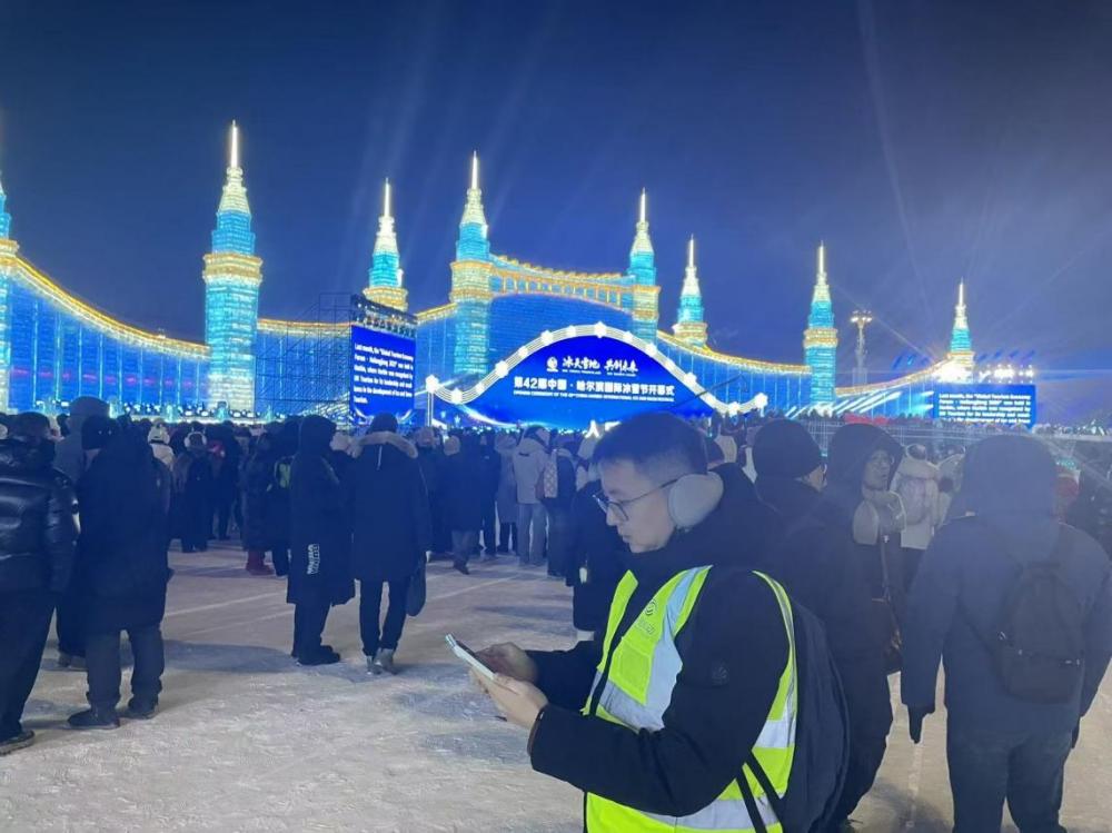 元旦期间,当众多游客齐聚中央大街跨年祈福时,保障人员迎着凛冽寒风,在人群中穿梭巡检,实时监控网络数据,并及时优化调整参数,以满格信号守护着人们的团圆时刻。
