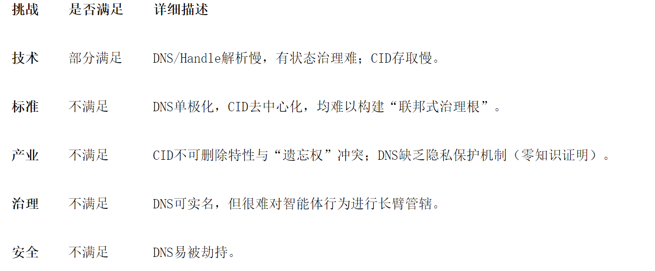 在“连接时代”,以域名解析为例,只需要返回几字节的IP地址,逻辑是静态的;但在“治理时代”,AI标识解析需要返回身份凭证、验证权限、确认合规性等,逻辑是动态。如果再涉及到高频交互,那现有技术很难同时满足海量高分辨率、实时低延迟、高鲁棒性等要求。细分包括“高分辨率治理”与“实时解析性能”的矛盾、“软硬绑定”带来的跨层互通难题等。