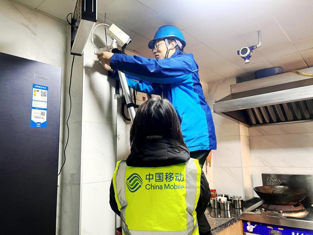 (湖北移动技术人员在养老院后厨安装“千里眼”设备)