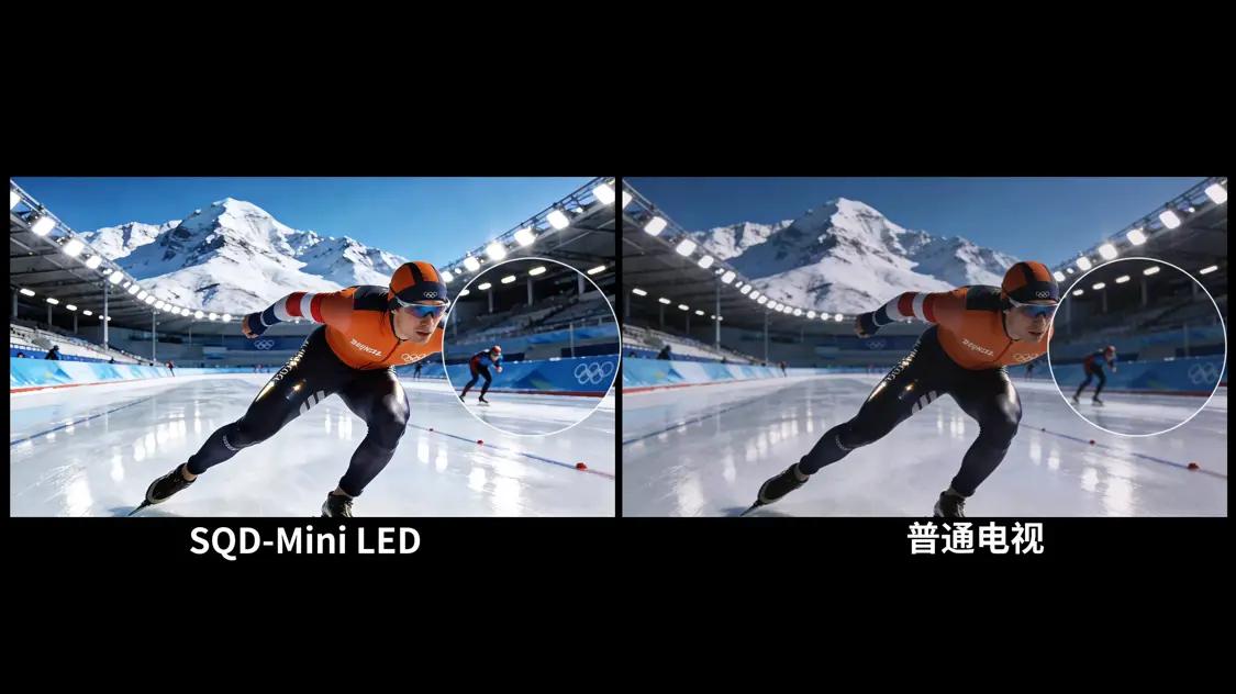 同时,SQD-Mini LED搭载的万象分区可以精准控制上万级背光分区,令雪山赛道的耀眼白光与阴影处的冰晶细节纤毫毕现,高速滑行的运动员轨迹清晰无拖影,避免普通分区背光技术常见的眩光与细节丢失。