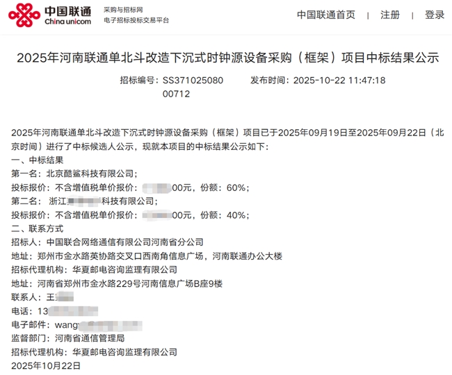 2025年深秋,中国联通河南省分公司精密时频设备采购项目揭晓,北京酷鲨科技有限公司以60%份额成为第一中标候选人,超越多家深耕近二十年的行业老牌厂商,引发行业高度关注。此项目专为机房GPS改北斗而设置。