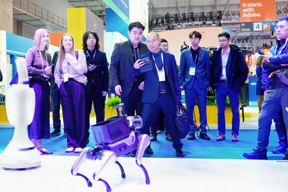 展会现场互动氛围热烈,天翼数字生活公司的天翼AI康养陪伴机器人、天翼AI运动陪伴机器狗以全方位的康养守护功能、灵活稳定的运动特性吸引了不少观众驻足。