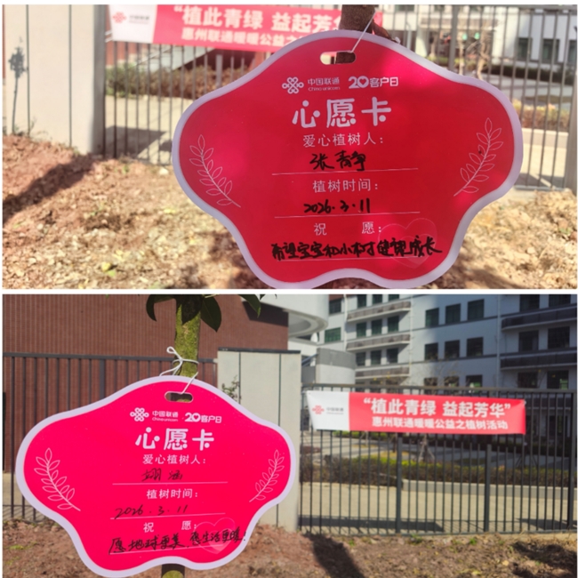 3月11日至12日,惠州联通分别在城区惠环古塘坳、小金口开展两场“植此青绿 益起芳华”主题植树活动,与100余名联通客户与志愿者挥锹培土,共同栽种“联通公益林”,用实际行动为大地添绿。客户分组植树,悬挂写满绿色心愿的“心愿卡”,“希望宝宝和小树健康快乐长大”、“愿地球更美、生活更暖”……一张张心愿卡在春风中摇曳,承载着大家对美好环境的向往与祝福。