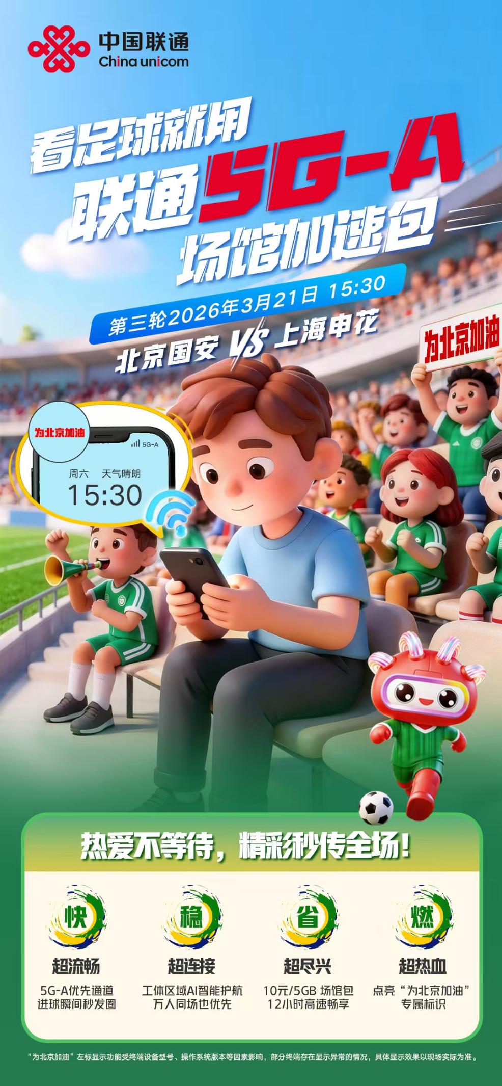 球场上,球员激烈角逐;看台上,球迷纵情呐喊。每一个精彩瞬间,都少不了与亲朋好友即时分享。中国联通在赛事期间特别推出5G-A场馆加速包,提供12小时畅享5GB高速流量,让用户彻底告别流量焦虑,尽情享受零卡顿、零延迟、零等待的极速上网体验。无论是进球瞬间秒发朋友圈,还是现场开启视频通话与远方亲友同享赛场激情,都能轻松实现。