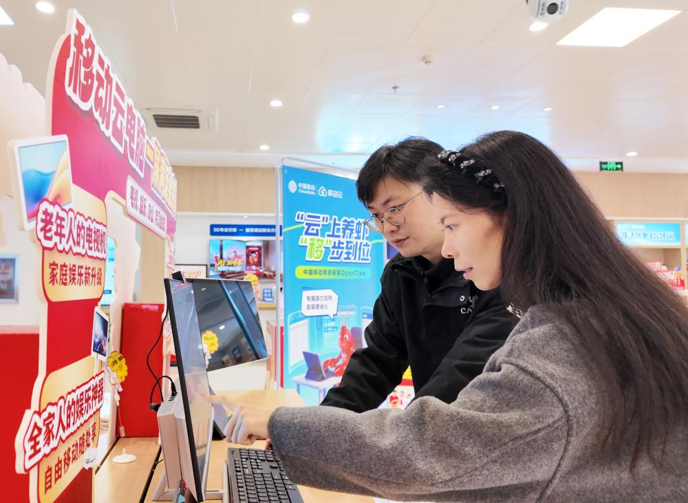 (用户在中国移动长港路营业厅体验“云电脑+MobileClaw”AI办公智能体)