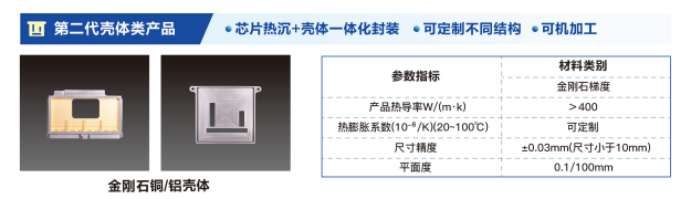 第二代:壳体类产品:第二代产品创新采用芯片热沉+壳体一体化封装技术,减小热阻并省去一道焊接工序,在小型化集成化方面实现突破。结合GPU微流道设计,实现“液冷+导热”双效散热,让散热效率再上一台阶;