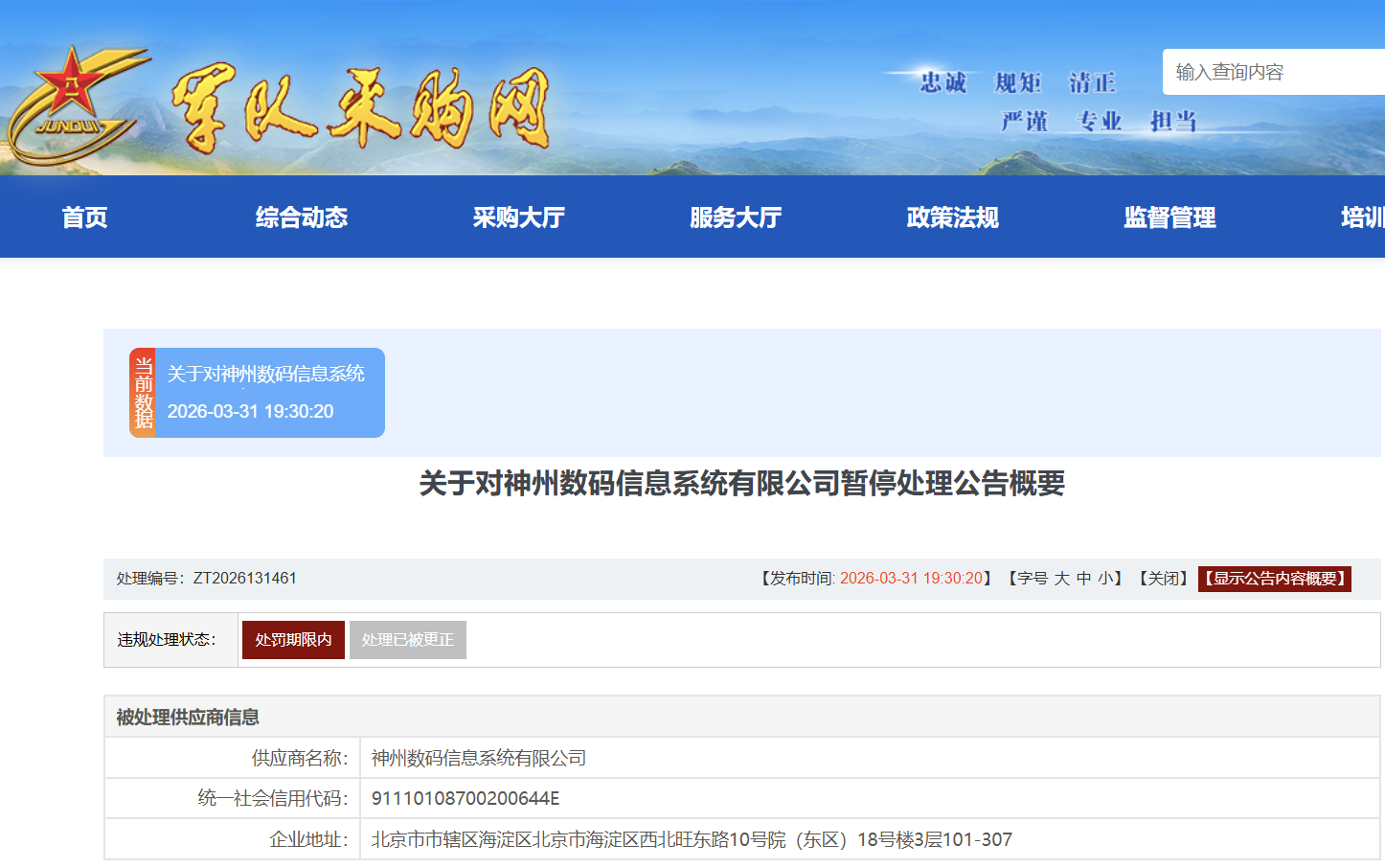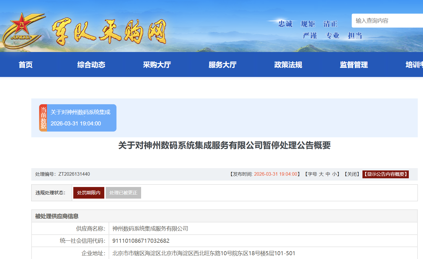 C114讯 4月9日消息(颜翊)日前,军采网发布公告,对神州数码旗下的神州数码系统集成服务有限公司、神州数码信息系统有限公司作出暂停处理决定。